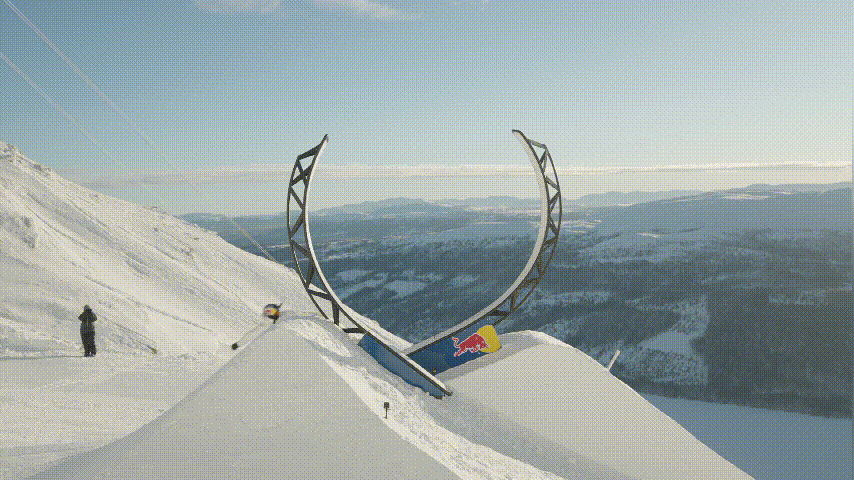 呲杆呲得不过瘾了!谢德(Tjäder)又玩起了“雪板过山车”,借助坡道腾空跃起,沿着未封闭圆形一侧轨道滑行,以倒挂金钟的姿势跃过长 3 米的间隙,又从相对而立的另一侧轨道滑下。