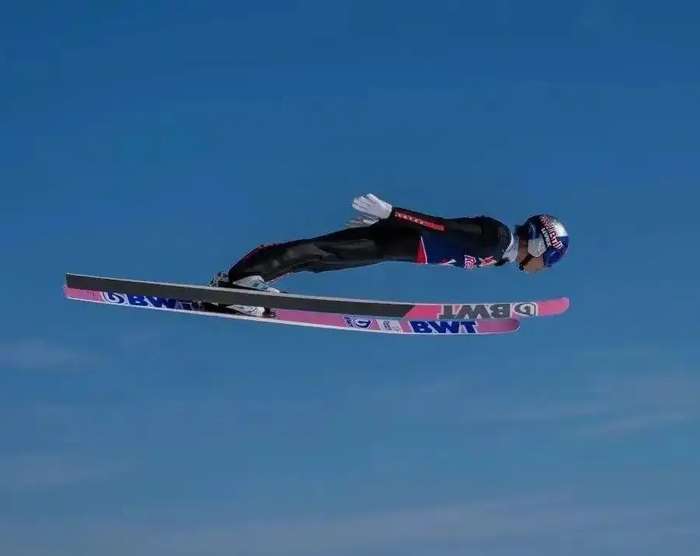 最终,他以稳定的姿态起跳,在空中保持了极为流畅的飞行,创造了飞行距离 291 米的跳台滑雪新世界纪录。