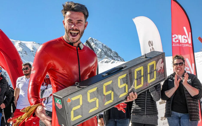 法国速度滑雪运动员西蒙·比利(Simon Billy),身披特制的红色“铠甲”,头戴白色雪盔,从上阿尔卑斯省瓦尔斯(Vars)的一条高速滑雪赛道上,以 255.50 公里/小时的速度滑降至终点,创下男子速度滑雪世界纪录,简直比一般的高速列车还要快。